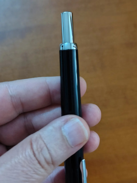 L'altro elemento che caratterizza la Jinhao 20 è il suo sistema di "chiusura" del pennino: in prossimità del foro d'uscita, infatti, troviamo una sorta di mini sportellino che, ogniqualvolta si preme il pulsante/bottone in cima alla penna, si apre o si richiude per lasciar uscire o rientrare il pennino. Mini sportellino che, lo capite benissimo, protegge il pennino anche da piccoli urti, polvere, liquidi e, cosa fondamentale, evita che l'inchiostro si secchi sulla punta dello stesso.