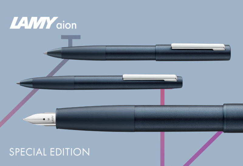Al momento del lancio, la Aion venne commercializzata soltanto in due colori: Black e Olive-Silver (una via di mezzo tra un grigio chiaro ed un verdino tenue); successivamente, nel corso del tempo, sono arrivate altre colorazioni o edizioni speciali… ed è proprio il caso del modello che vi presento: la mia Lamy Aion, infatti, è l'edizione speciale del 2023 nella fantastica colorazione Deep Dark Blue (un blu molto intenso con leggere tonalità violacee).