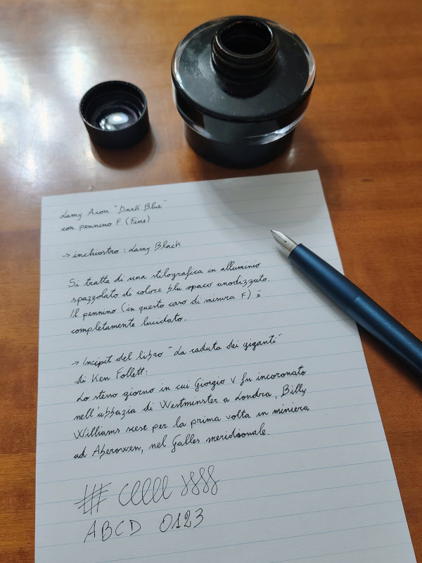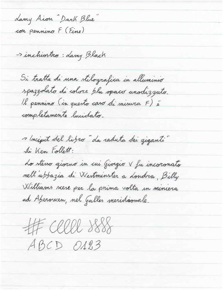 Per finire, eccovi la mia prova di scrittura: per provare la Lamy Aion mi sono servito di carta a righe Pigna e dell'inchiostro Lamy Black in calamaio (perciò, ho montato il converter sulla Lamy Aion).