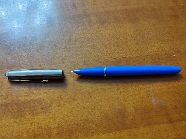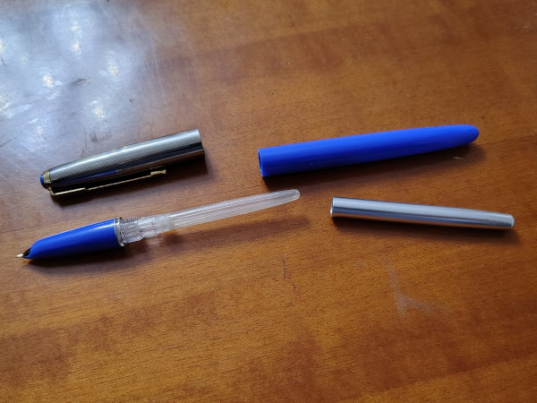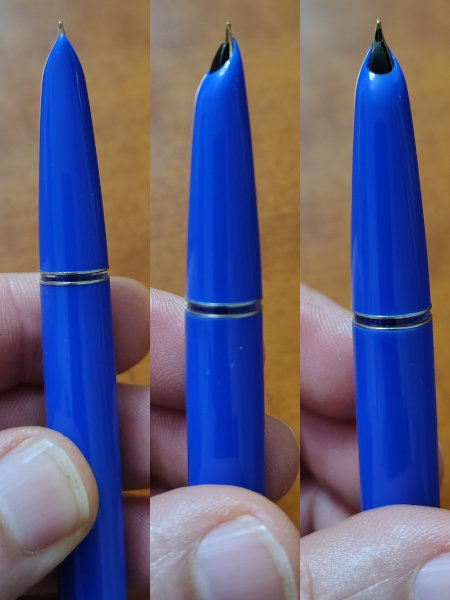 Tuttavia, contrariamente a quanto ci si potrebbe aspettare da un prodotto a buon mercato, la sua scrittura è molto fluida e scorrevole: il pennino in acciaio è carenato (incappucciato), ha misura F (fine) e fornisce una linea molto sottile e tendente al secco (lo spessore del tratto è quasi quanto un capello).