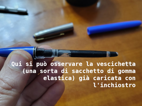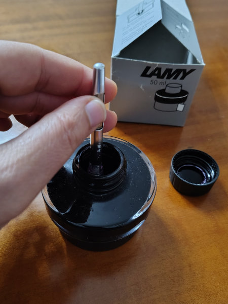 - Immergiamo il pennino nel calamaio contenente l'inchiostro (non solo la punta, ma anche qualche millimetro della penna stessa);