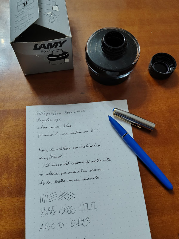 Come sempre, chiudo la mia recensione con la "prova su strada": per testare la Hero 616-2 ho usato l'inchiostro Lamy Black (che è sempre una garanzia) ed un foglio di carta Rhodia puntinato.